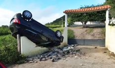 Homem escapa ileso após carro parar em cima de muro de chácara em São José da Tapera