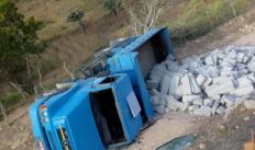 Caçamba carregada com pedras tomba depois de não conseguir subir ladeira em Mata Grande