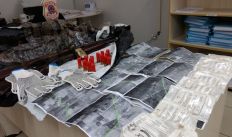 Foram encontradas 2 espingardas calibre 12 e 14 munições do mesmo calibre como, também, luvas tricotadas de algodão e luvas cirúrgicas.