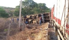 Caminhão que transportava galinhas atropela 3 cavalos, bate em carro e capota em Santana
