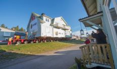 Casas são transportadas inteiras em cima de caminhões para o novo local onde a cidade será instalada
