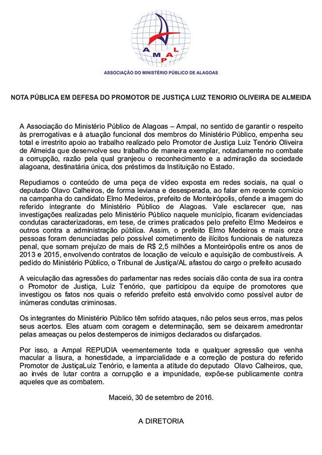 Ampal defende promotor Luiz Tenório e diz que deputado agiu de forma leviana e desesperada