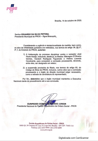 A executiva nacional do Partido Republicano de Ordem Social (PROS) autorizou nesta quarta-feira (14) o diretório municipal da legenda a suspender a filiação e retirar a candidatura à reeleição do vereador de Água Branca José Paulo Araújo, mais conhecido como Zé Paulo Pedreiro.