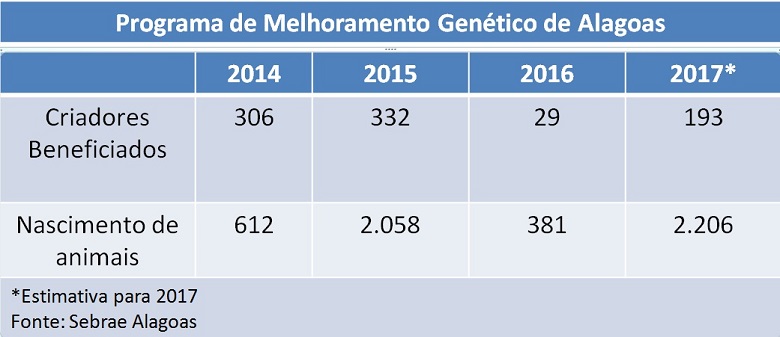 De acordo com Marcos Fontes, que é gerente adjunto da Unidade de Agronegócios do Sebrae Alagoas, a previsão é que sejam aportados, em 2017, mais de R$ 3 milhões para o Programa de Melhoramento Genético em Alagoas. Espera-se, com isso, atender a cerca de 200 produtores.