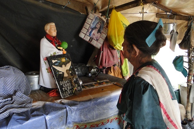 O colchão e os cobertores ficavam no chão de terra batida, o fogo de carvão estava logo ali ao lado, o pote que acumulava a água de beber também. Numa rústica estrutura de madeira, ficavam algumas panelas e uma bacia com água que servia para lavar os pratos. A barraca de lona não devia ter mais que sete ou oito metros quadrados e seu interior guardava algumas caixas com pertences e era decorado por imagens de santos e santas do catolicismo.