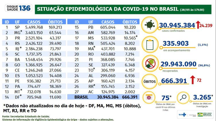 O Brasil teve 24.239 novos casos e 72 mortes por covid-19 em 24 horas, segundo o boletim epidemiológico registrado neste sábado (28) pelo Ministério da Saúde. Desde o início da pandemia, foram registrados 30.945.384 casos e 666.391 mortes.