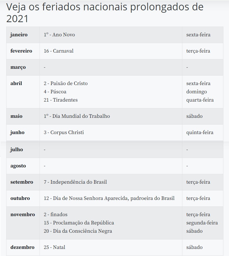 Em meio a uma pandemia e expectativa da chegada de vacinas, o ano de 2021 terá três feriados prolongados nacionais, sem considerar os feriados estaduais e municipais e festejos como carnaval e Corpus Christi, que são pontos facultativos – e não feriados - em diversas cidades. Feriados prolongados são os que caem às segundas ou sextas-feiras, podendo ser emendados com os fins de semana.