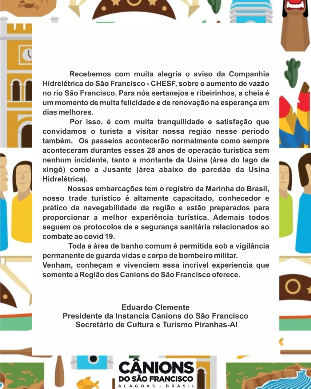 A Secretaria de Turismo da cidade de Piranhas informou ao site Correio Notícia que a situação do Rio São Francisco está tranquila. Desde ontem (12) a Companhia Hidrelétrica do São Francisco (Chesf) está aumentando, de maneira gradativa, o volume de água na represa que corta a cidade.