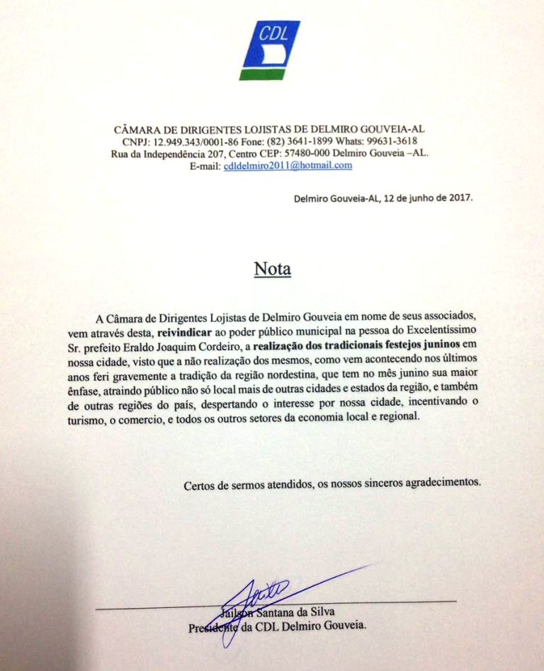 A Câmara de Dirigentes Lojistas (CDL) de Delmiro Gouveia emitiu, nesta segunda-feira (12), uma nota direcionada ao prefeito Padre Eraldo (PSD) para cobrar dele a realização dos festejos juninos no município.