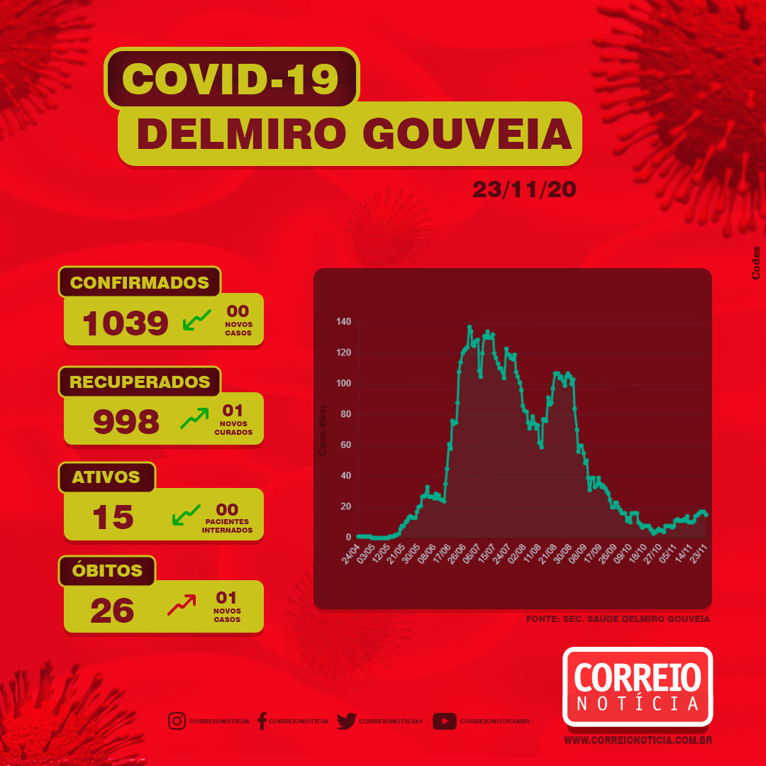 Com mais um óbito, o município de Delmiro Gouveia tem 1.039 pacientes que testaram positivo para a doença causada pelo novo coronavírus. A informação consta no boletim epidemiológico da Secretaria Municipal de Saúde, edição desta segunda-feira (23).