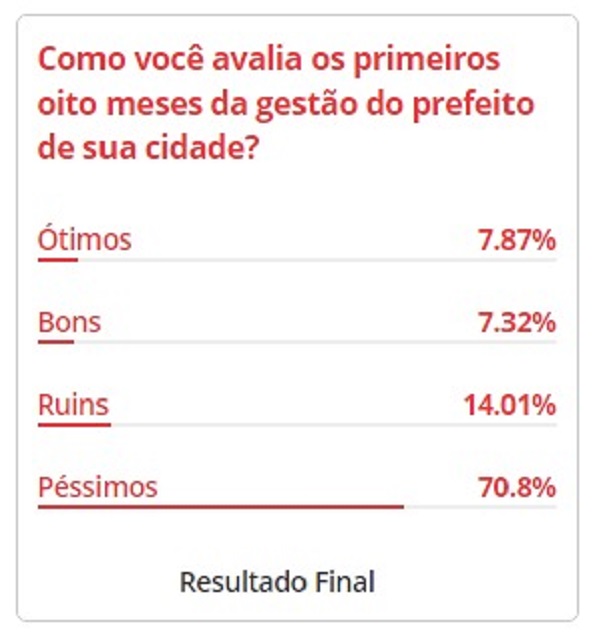 Com a pergunta “Como você avalia os primeiros oito meses da gestão de sua cidade?”, a enquete tinha como respostas “Ótimos”, “Bons”, “Ruins” e “Péssimos”. O período analisado refere-se de janeiro a agosto deste ano.