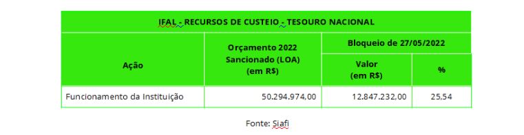 Para o Instituto Federal de Alagoas (Ifal), instituição integrante da Rede Federal de Educação Profissional, Cienti?fica e Tecnolo?gica, o bloqueio dos recursos foi no montante de R$ 12.847.232,00, de acordo com o Sistema Integrado de Administração Financeira do Governo Federal (Siafi), o que representa uma redução de 14,54% do orçamento discricionário total.