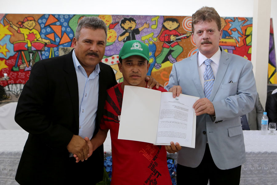 | Corregedor Klever Loureiro e prefeito João Carlos Rodrigues entregam título de propriedade à morador de Senador Rui Palmeira (foto: Caio Loureiro) |
