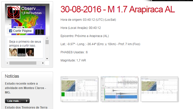 Em seu portal na internet, o Observatório confirmou que os relatos dos moradores de Arapiraca sobre um possível tremor de terra sentido na cidade realmente se trataram de um abalo sísmico, que é provocado pelo movimento das placas tectônicas. Segundo o Obsis/UNB, o fenômeno teve magnitude de 1,7 mR e ocorreu próximo a Arapiraca a 00h40 de terça-feira (30).