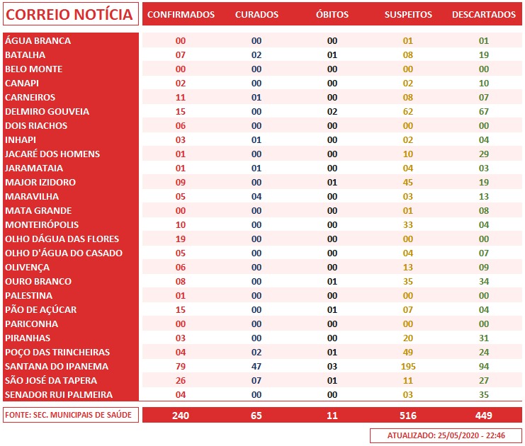 Santana do Ipanema e São José da Tapera lideram número de casos de Covid-19 no Sertão