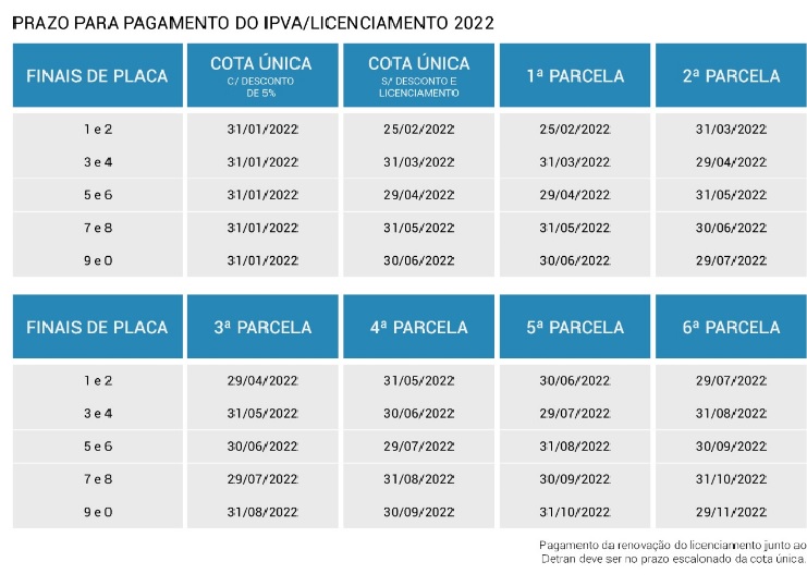 Cada final de placa possui uma data-limite para pagamento da cota única sem desconto ou da primeira parcela. As placas de finais 1 e 2 têm até 25 de fevereiro; placas de finais 3 e 4 até 31 de março; placas de finais 5 e 6 até 29 de abril; placas de finais 7 e 8 até 31 de maio e as placas de finais 9 e 0 até 30 de junho.