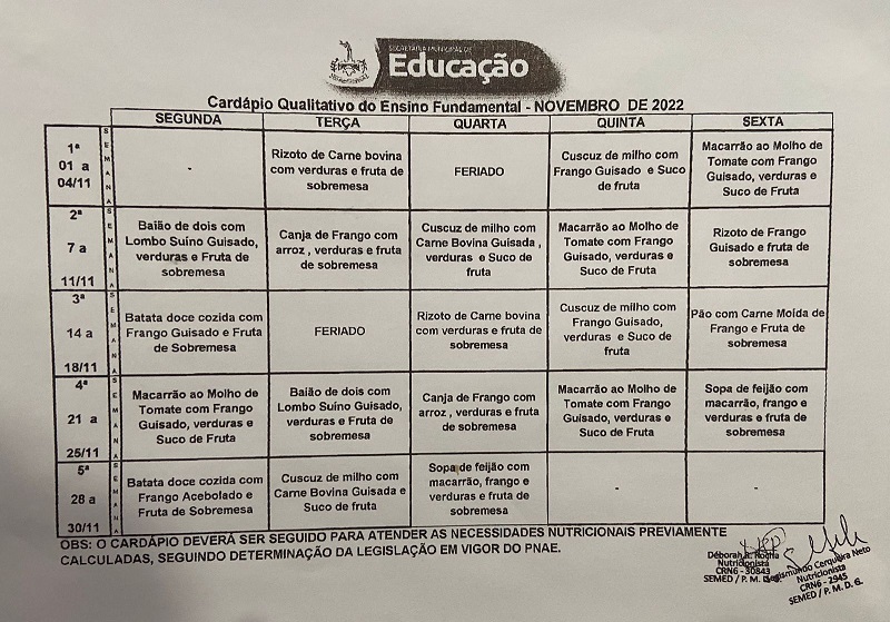 O cardápio preparado pela equipe técnica da Secretaria Municipal de Educação, no setor de merenda, conta com frutas de sobremesa, no mínimo 3 vezes por semana, e proteína de alto valor biológico nas preparações principais, no mínimo 4 vezes por semana, garantindo assim promoção à saúde e a garantia do direito humano à alimentação adequada e saudável no ambiente escolar.