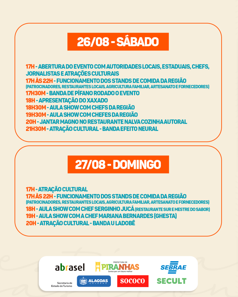 O acesso ao 2° Festival Gastronômico de Piranhas é gratuito e a programação vai das 17h às 22h.