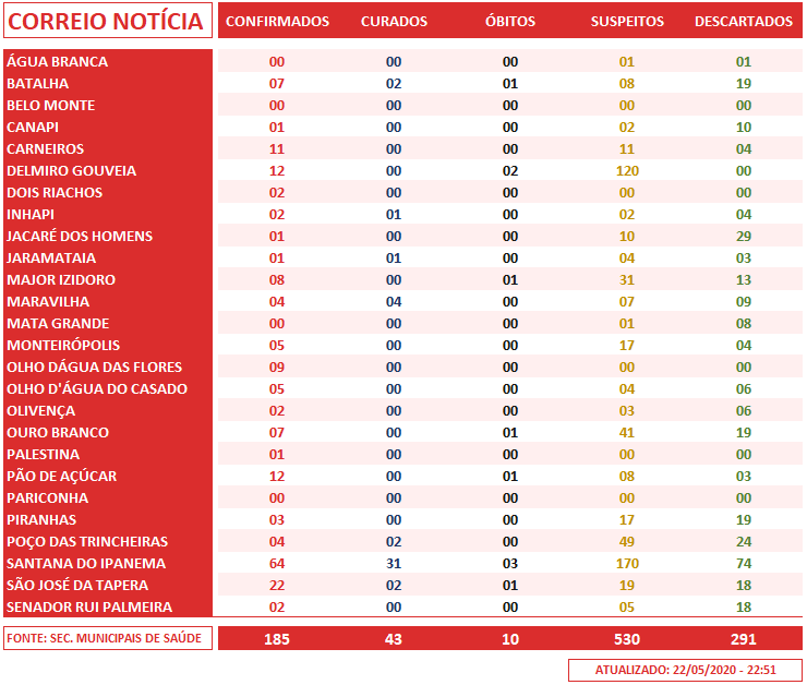 Paralelamente aos dados divulgados pelos boletins epidemiológicos do Centro de Informações Estratégicas e Resposta em Vigilância em Saúde de Alagoas (CIEVS/AL), os municípios têm divulgado informes diários com dados mais atualizados sobre o novo coronavírus.