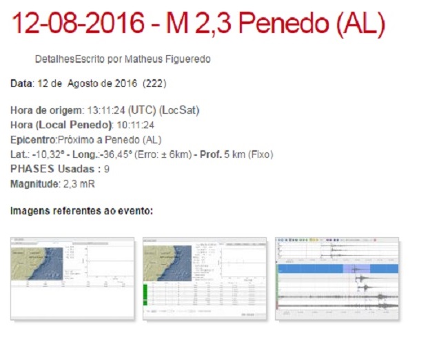 Segundo o Obsis/UNB, o abalo sísmico que teve como origem o município de Penedo foi registrado a cerca de 5 quilômetros de profundidade e atingiu 2,3 pontos de magnitude. A hora do fenômeno foi 10h11 da manhã da última sexta-feira (12), o mesmo horário que os moradores de Jaramataia relataram, por meio das redes sociais, ter sentido o tremor de terra.