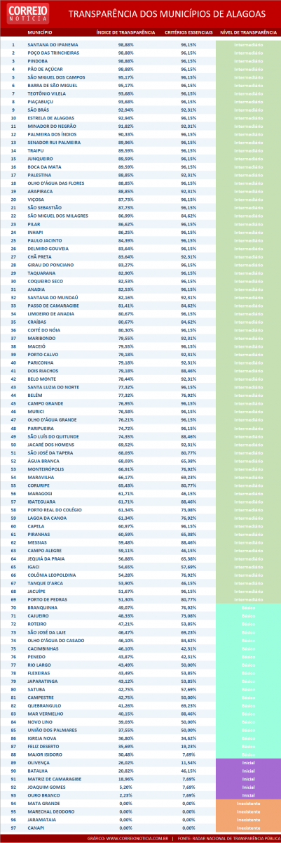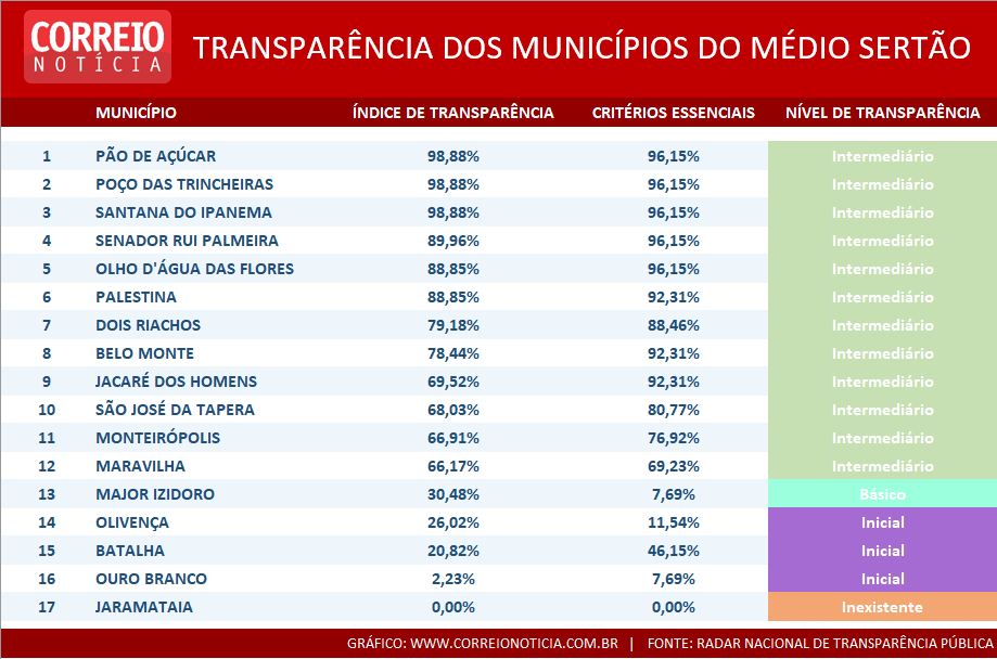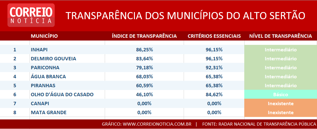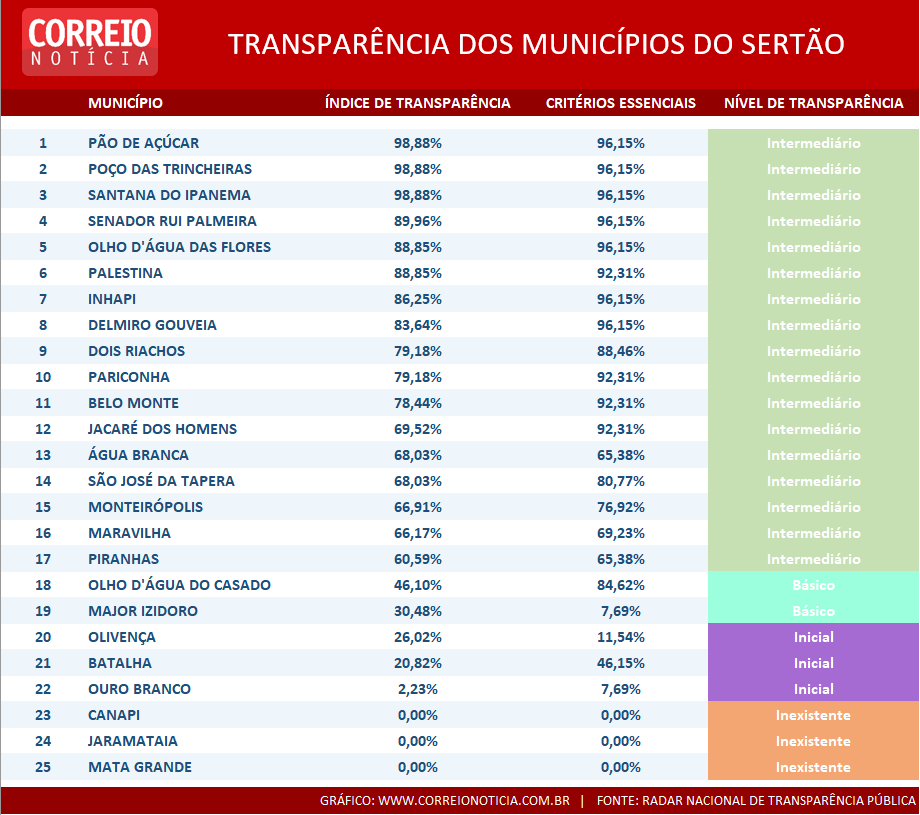 Baseado no levantamento feito pelo Radar Nacional de Transparência Pública, maior repositório de informações sobre transparência pública do Brasil, o portal Correio Notícia fez uma lista das prefeituras mais e as menos transparentes de Alagoas, inclusive aquelas que estão situadas no Sertão, especificando o Médio e Alto Sertão.