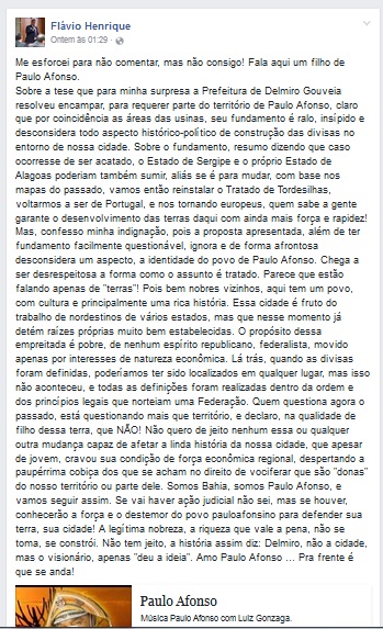 “Mas, confesso minha indignação, pois a proposta apresentada, além de ter fundamento facilmente questionável, ignora e de forma afrontosa desconsidera um aspecto, a identidade do povo de Paulo Afonso. Chega a ser desrespeitosa a forma como o assunto é tratado. Parece que estão falando apenas de "terras"! Pois bem nobres vizinhos, aqui tem um povo, com cultura e principalmente uma rica história. Essa cidade é fruto do trabalho de nordestinos de vários estados, mas que nesse momento já detém raízes próprias muito bem estabelecidas. O propósito dessa empreitada é pobre, de nenhum espírito republicano, federalista, movido apenas por interesses de natureza econômica”, declarou o vice-prefeito de Paulo Afonso no Facebook.