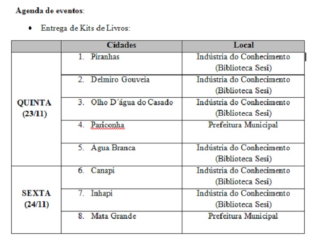 A entrega dos livros contemplará as Unidades SESI Indústria do Conhecimento, que são centros multimídia com bibliotecas, e também as bibliotecas públicas municipais. Esta ação será realizada nos municípios de Piranhas, Delmiro Gouveia, Olho D´água do Casado, Pariconha, Água Branca, Canapi, Inhapi e Mata Grande.