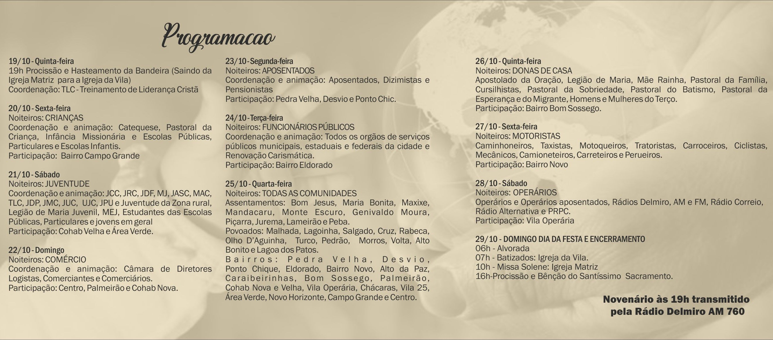 Confira abaixo a programação da festa, que é realizada pela Paróquia de Nossa Senhora do Rosário: