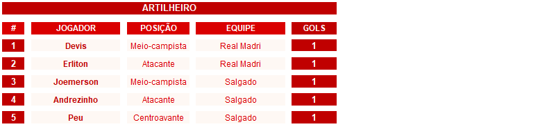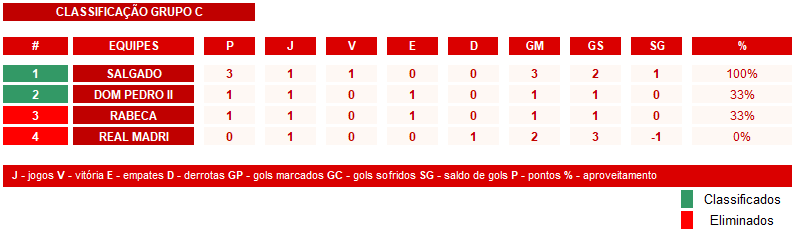 Com a vitória, o time do Salgado é o líder do grupo C, enquanto o Real Madrid amarga a última colocação. A segunda posição é da equipe da Dom Pedro II, devido ao número de cartões amarelos.
