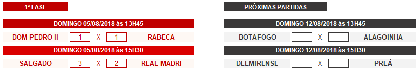 O primeiro jogo aconteceu às 14h, entre as equipes da Dom Pedro II e do povoado Rabeca, que abriu o placa aos 22 minutos, do primeiro tempo, com o atleta Igo, que vestiu a camisa 11. O placa só foi igualado aos 17 minutos da segunda etapa, com o gol de Lourinho, camisa 14. Placa final: Dom Pedro II 1 x 1 Rabeca.