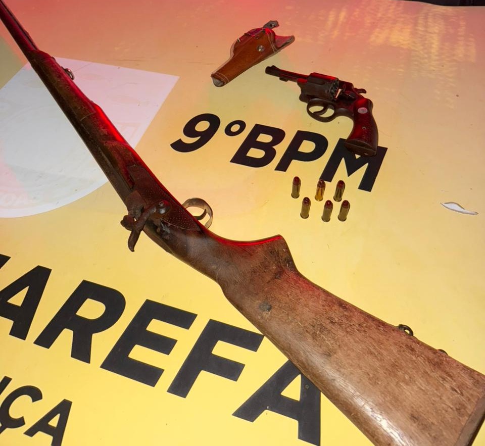 No momento da abordagem, o homem resistiu à prisão, sendo necessário o uso de algemas para garantir a segurança dele e da equipe militar. Durante a revista, os policiais encontraram com ele um revólver calibre .38 com seis munições intactas, além de uma espingarda artesanal, conhecida como “soca-tempero”.