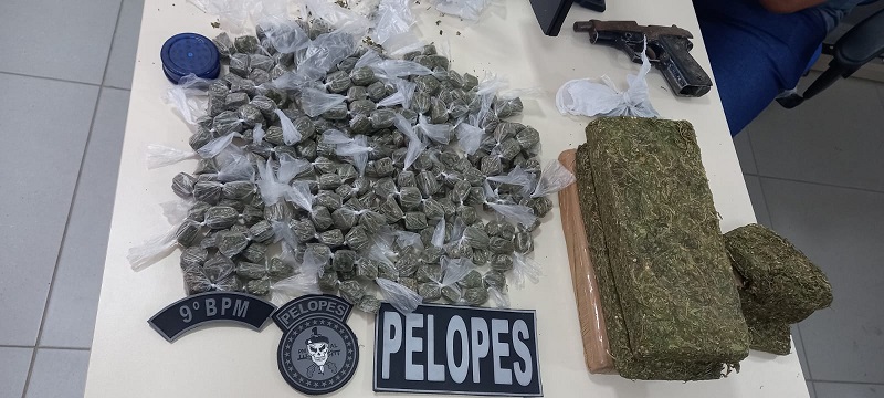 Conforme os militares, ele estava com um bolsa nas costas, na qual havia 264 trouxinhas de maconha (842 gramas) e uma pistola calibre .380, sem funcionamento. Durante a abordagem o suspeito confessou para os policiais que possuía mais drogas em casa. No imóvel foram apreendidos 3 tabletes de maconha prensada, com 3 quilos e 100 gramas; 48 pedras de crack (5 gramas) e R$ 183,00 em espécie.
