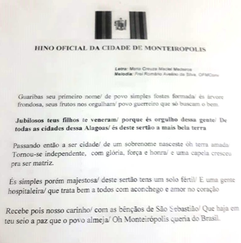 Agora, assim como outras cidades da região, Monteirópolis tem um hino, que homenageia e conta um pouco da história do lugar. A letra é de autoria da professora e catequista Maria Creuza Maciel Medeiros, enquanto a melodia é de Frei Romário Avelino da Silva, também natural da cidade, mas que atualmente mora em Roma, na Itália.