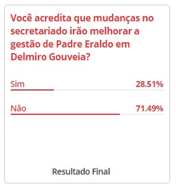 Por outro lado, 28% responderam que acreditam em melhorias na gestão de Padre Eraldo, prefeito da cidade, a partir das mudanças realizadas no comando das pastas
