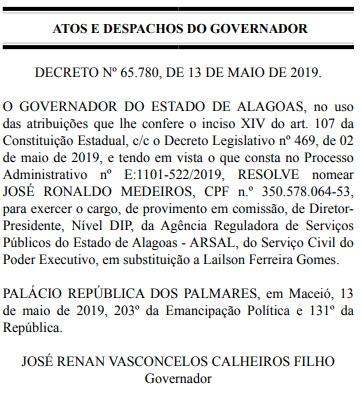O ex-deputado estadual Ronaldo Medeiros foi nomeado pelo governador Renan Filho (MDB) para o cargo de diretor-presidente da Agência Reguladora de Serviços Públicos do Estado de Alagoas (Arsal). A nomeação fou publlicada em edição suplementar do Diário Oficial do Estado (DOE).