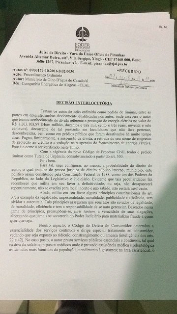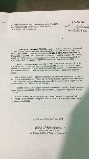 Por essa razão, nesta quinta-feira (9), José Gualberto entregou ao MPC um ofício no qual esclarece que, em abril de 2016, contestou na própria Eletrobras as referidas cobranças. Em maio daquele mesmo ano, ele ingressou com o pedido de liminar na Justiça, o qual foi concedido.