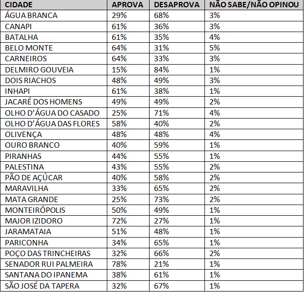 O primeiro colocado em desaprovação, segundo o estudo, é Padre Eraldo (PSD), prefeito de Delmiro Gouveia, com 84%. Em seguida aparecem Erivaldo Mandu (PP), de Mata Grande, com 73%, Zé da Emater (PT), de Olho D’água do Casado, com 71%, e Zé Carlos (PSDB), de Água Branca, com 68%.