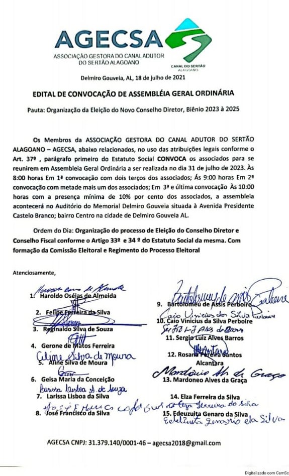 A Associação Gestora do Canal Adutor do Sertão Alagoano (AGECSA) anunciou a convocação de uma Assembleia Geral Ordinária para o próximo dia 31 de julho. O encontro tem como principal objetivo discutir a organização do processo eleitoral para o Conselho Diretor e o Conselho Fiscal, além de abordar a urgente necessidade de nova eleições diretoria da entidade, por conta que a atual esta vencida. A reunião ocorrerá em primeira convocação às 8 horas, em segunda convocação às 9 horas e, caso necessário, em terceira convocação às 10 horas, exigindo a presença mínima de 10% dos associados para sua validação. O local escolhido é o Auditório do Memorial Delmiro Gouveia, em Delmiro Gouveia, Alagoas.